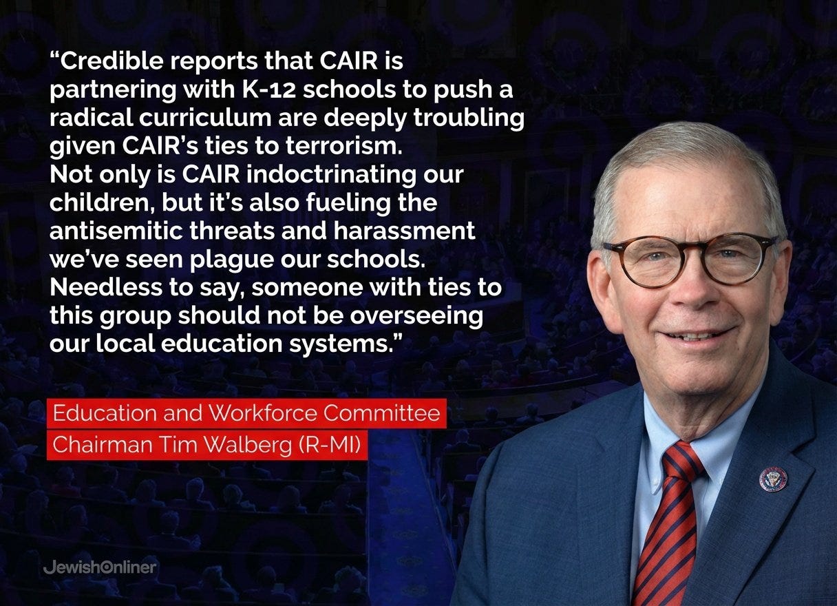 “Credible reports that CAIR is partnering with K-12 schools to push a radical curriculum are deeply troubling given CAIR’s ties to terrorism,” Walberg told Jewish Onliner. “Not only is CAIR indoctrinating our children, but it’s also fueling the antisemitic threats and harassment we’ve seen plague our schools. Needless to say, someone with ties to this group should not be overseeing our local education systems.”
