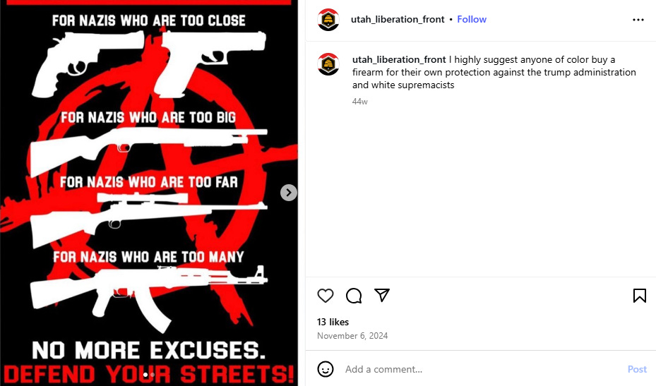 Both movements self-identify as anti-imperialist and anti-capitalist, viewing their struggles as part of a broader global resistance to Western hegemony. They align themselves with traditional enemy nations including Iran, China, North Korea, and Venezuela, while expressing solidarity with designated terrorist organizations such as Hamas, Hezbollah, and the Houthis. This intersectionality is exemplified by events like the "Palestine: The Struggle Against International Fascist Counterrevolution" discussion, which explicitly connects anti-fascist organizing with Palestinian liberation struggles. An Instagram post by Utah ‘resistance’ movement, Utah Liberation Front, bears a picture of a gun similar to the one Tyler Robinson used in the attack, “For Nazis who are too far:"