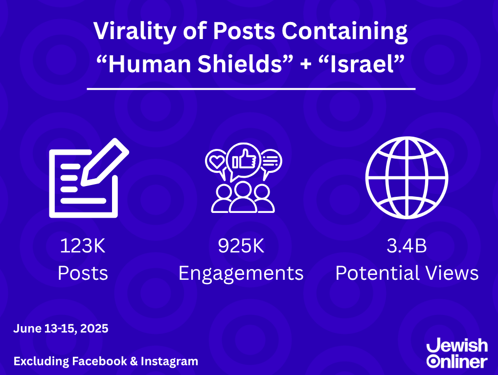 A social media analysis by Jewish Onliner on June 13, 2025, revealed more than 123,000 posts containing both “human shields” and “Israel” in a single day. These posts generated roughly 925,000 interactions and reached an estimated 3.4 billion users. The volume and spread of this content suggest coordinated manipulation, not organic discourse.