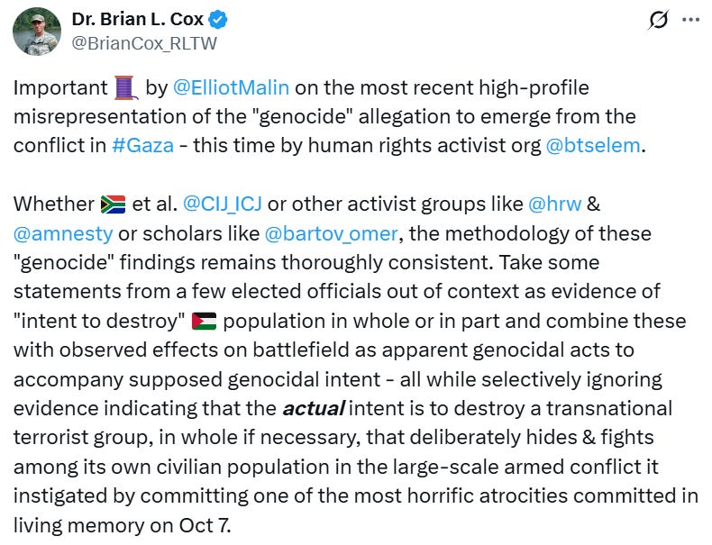 International humanitarian law expert and lawyer Elliot Malin was among the first to identify the concerning methodology within B'Tselem's report. In his detailed analysis, Malin highlighted how the organization's approach deviates from the established 1948 Genocide Convention, which requires proving specific intent to destroy a national, ethnic, racial, or religious group "in whole or in part."