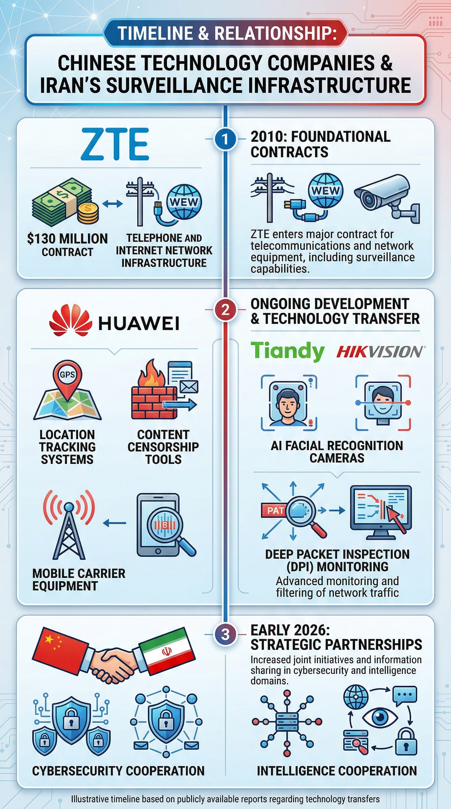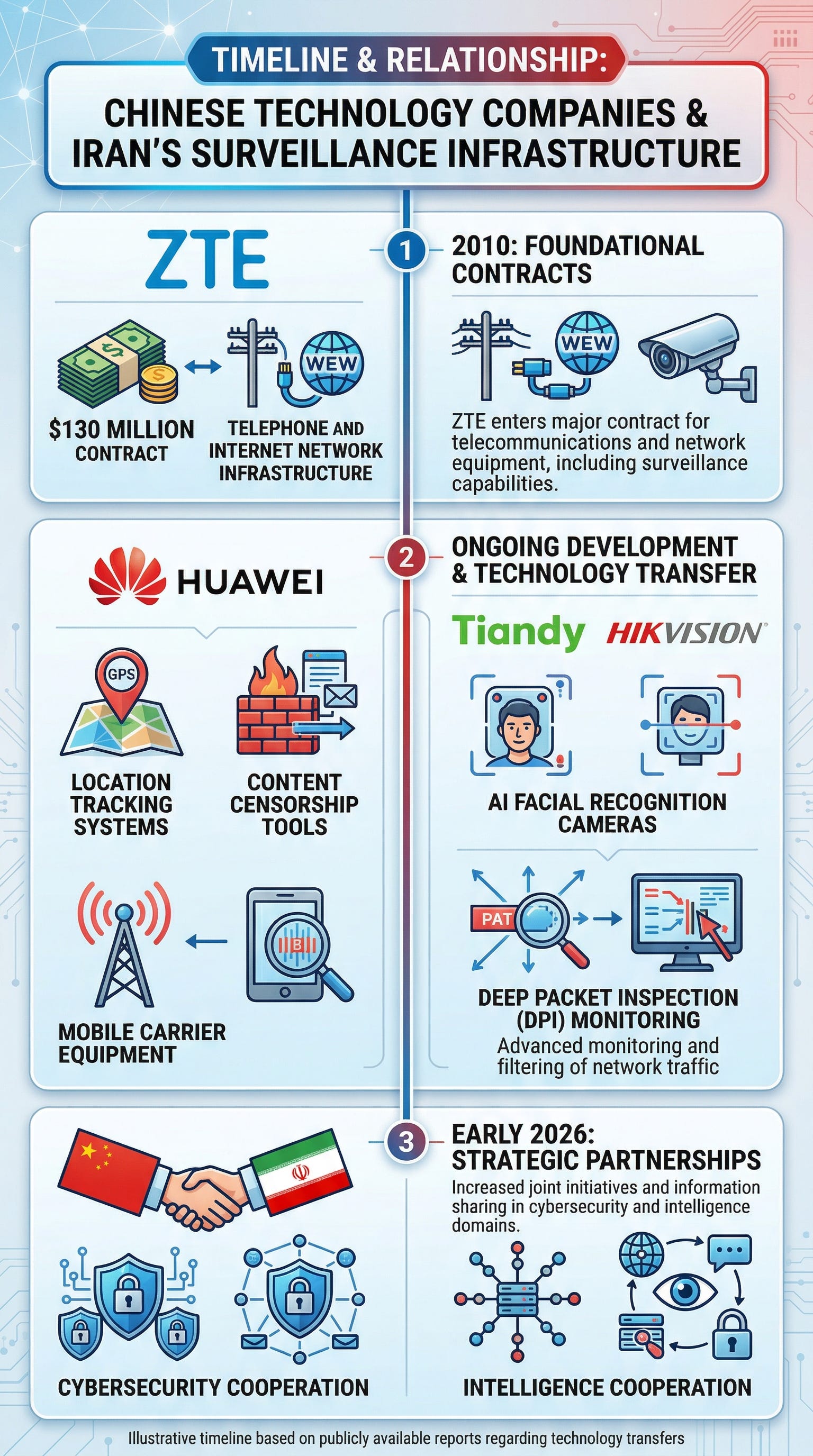 Huawei became a major telecom equipment supplier in Iran, supplying location-tracking services and content-censorship tools to mobile carriers. Chinese firms Tiandy and Hikvision subsequently supplied AI-enabled facial recognition cameras, while ZTE and Huawei provided DPI and related monitoring tools that enabled extensive surveillance and filtering across major parts of Iran’s telecom infrastructure.