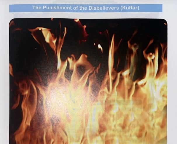 The ISF’s Level 5 and 6 textbooks warn that “Allah continues giving severe warnings to the kuffar [non-believers]” and that “those who disbelieve in Allah will suffer the punishment of Hell, which is a terrible place to be in.”