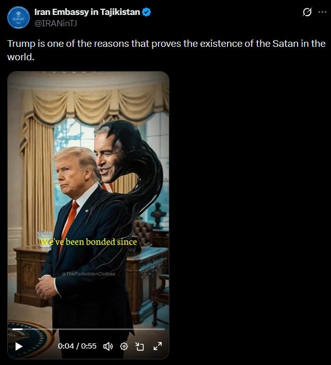The embassy accompanied the Epstein video with the caption: “Trump is one of the reasons that proves the existence of the Satan in the world.”