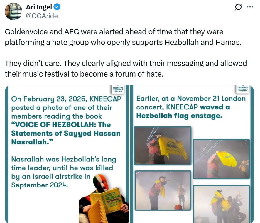 "Goldenvoice and AEG were alerted ahead of time that they were platforming a hate group who openly supports Hezbollah and Hamas.