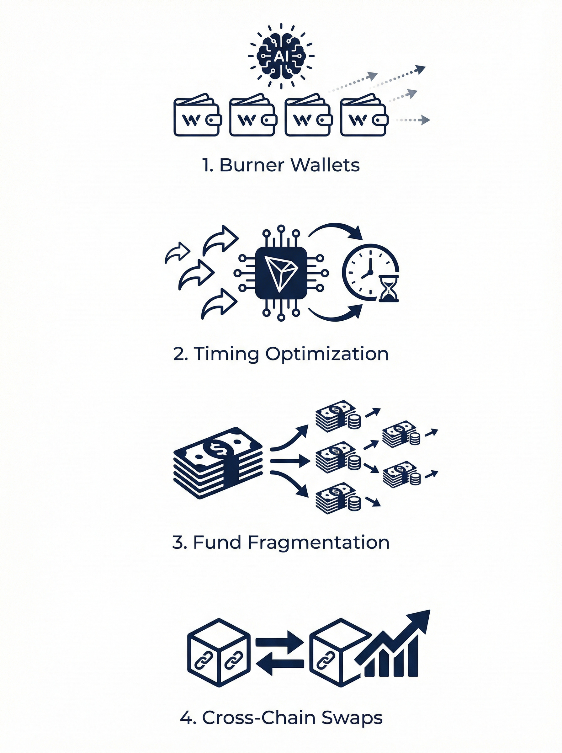 Alexe outlines four operational phases enabling terrorist organizations to evade detection. AI agents generate disposable “burner wallets” used for single transactions before abandonment, defeating address-based blacklisting. Machine learning algorithms optimise transaction timing and routing to blend micro-transfers within legitimate blockchain activity—ISKP notably exploited TRON’s high-volume network to execute transfers during peak trading hours.