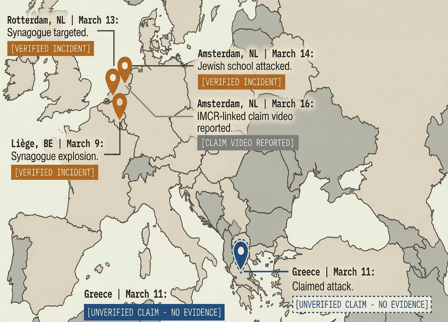 March 14 — Amsterdam, Netherlands: Explosion damages a Jewish school; mayor calls it a deliberate attack; separate outlets report an IMCR-linked claim video.