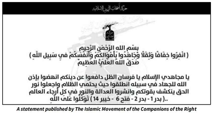 The Israeli government report says “Ashab al-Yamin” may be linked to Harakat Ansar Allah al-Awfiya (HAAA), an Iraqi militia designated by the U.S. State Department in June 2024. HAAA has “previously used the alias ‘Ashab al-Yamin,’” according to the report. The U.S. Department of National Intelligence identified AAA as an Iran-backed Iraqi Shia militia.