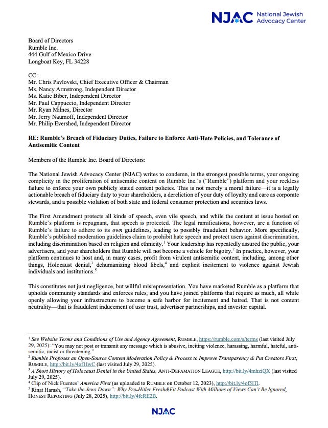 The NJAC letter asserts that Rumble has created an environment where antisemitic content thrives. NJAC contends that Rumble has done "willful misrepresentation" by marketing itself as enforcing content policies while simultaneously allowing its infrastructure to become "a safe harbor for incitement and hatred."