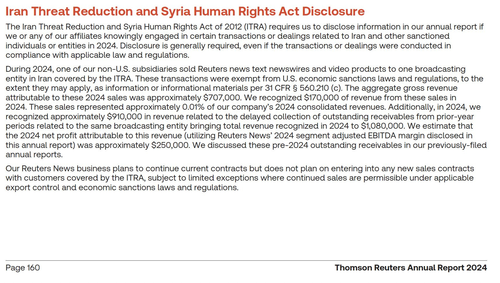 The NCRI investigation found that Reuters did not disclose to investors that its client was IRIB. NCRI researchers discovered that Reuters referred only to "one broadcasting entity in Iran" and cited a U.S. sanctions exemption for "informational materials" like newswires.