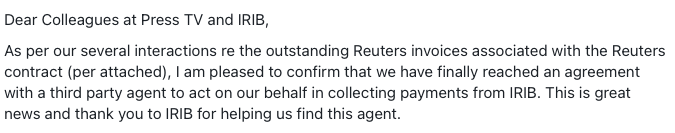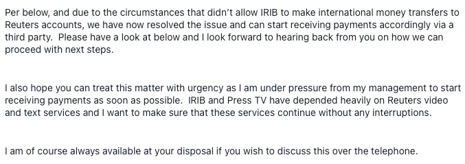 Leaked emails unearthed by NCRI show that when IRIB couldn't pay directly, likely due to sanctions, it introduced a third-party agent as an intermediary. The emails indicate that Reuters agreed to receive payment through this agent, with a Reuters director thanking IRIB for making the introduction and confirming an agreement with the intermediary.