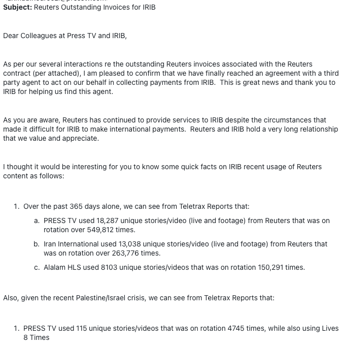 The relationship appeared particularly significant during major regional conflicts. NCRI’s findings highlight that Reuters noted its services were especially important to IRIB during "the recent Palestine/Israel crisis"—likely referring to the 2021 Israel-Hamas war. A leaked internal email from Reuters to IRIB references the outlet's use of Reuters content, including "tens of thousands of unique stories/video (live and footage) on rotation hundreds of thousands of times."