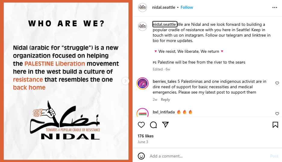 Nidal Seattle describes itself as a “new organization focused on helping the Palestine Liberation movement here in the West build a culture of resistance that resembles the one back home,” with a mission statement emphasizing opposition to what it terms "US imperialism" and "Zionist colonialism." The group, which appears to have emerged in 2024, has rapidly established itself as one of the most militant pro-Palestinian voices in Seattle's activist community.