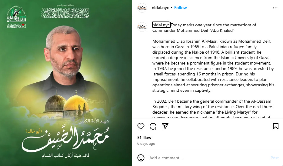 In their memorial post, Nidal NYC celebrated Deif as a "martyr" and "symbol of resilience," praising his role in what they termed the "Al-Aqsa Flood operation" – the October 7 attacks. The post described his "strategic brilliance" and claimed his "legacy lives on in the hearts of revolutionaries worldwide.”