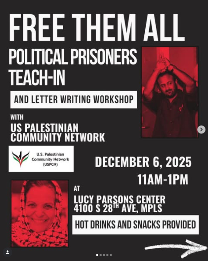 On December 6, 2025, the Lucy Parsons Center hosted an event with the U.S. Palestinian Community Network featuring a “political prisoners” teach-in and letter-writing workshop.