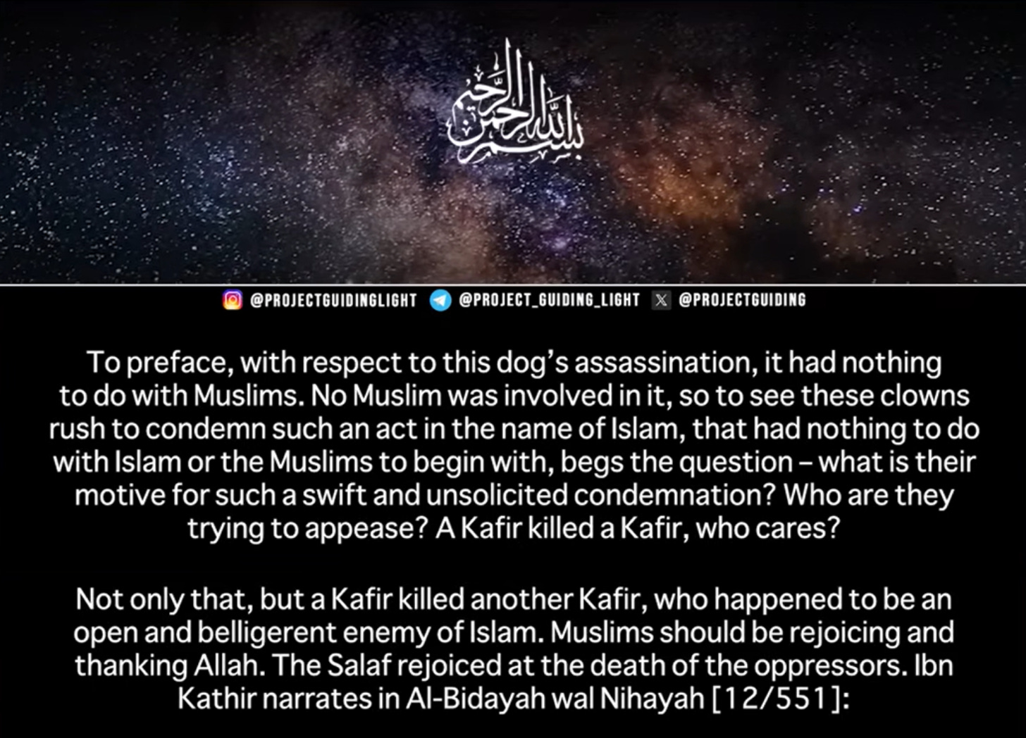 In the video distributed across social media, Project Guiding Light labeled Kirk as “this dog” and described his assassination as a “praiseworthy action.” The outlet justifies the killing by showing a clip of Kirk stating that the Prophet Muhammad married a six-year-old, then launches into extensive citations from early Islamic texts celebrating what it calls “vigilante justice.”