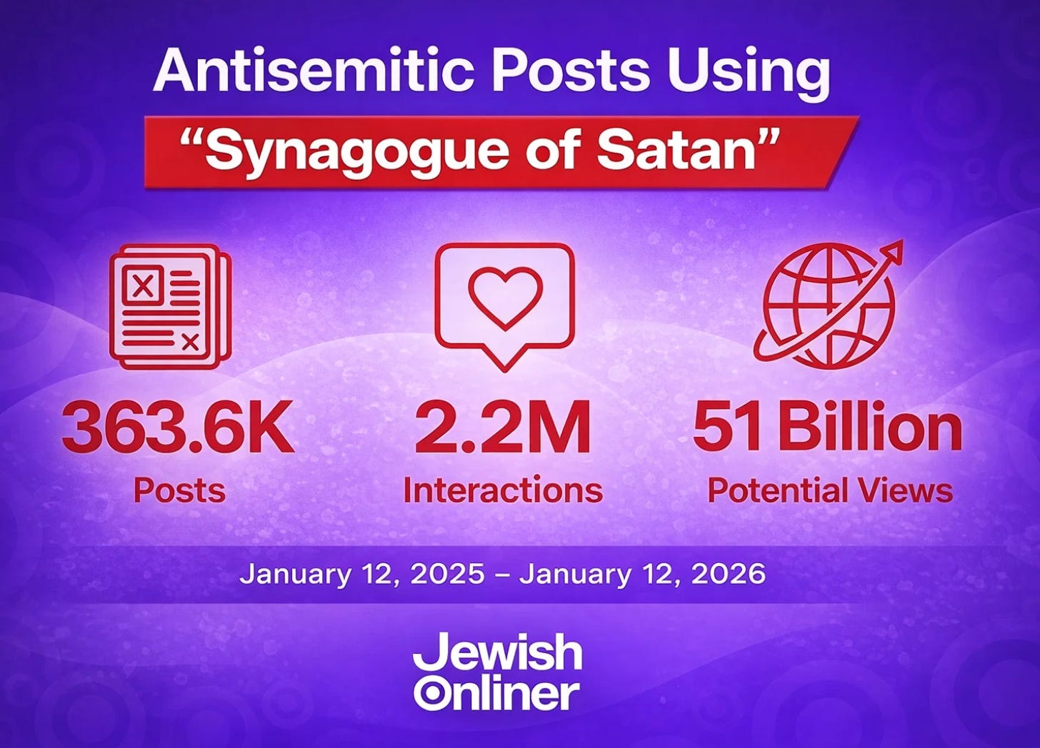 Using social media listening tools, Jewish Onliner tracked the proliferation of “synagogue of Satan” on X from January 12, 2025 to January 12, 2026. The analysis identified 363,600 posts containing the phrase, generating 2.2 million interactions and reaching a potential audience of 51 billion views.