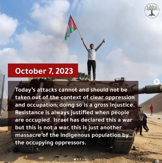 On October 7, 2023, PACC posted a photo of Palestinian terrorists infiltrating into Israel and published a statement justifying the attack.
