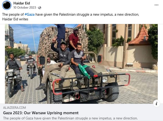 Another virtual speaker, Haidar Eid, is a member of the Palestinian Campaign for the Academic and Cultural Boycott of Israel (PACBI). In response to Hamas’ October 7 massacre, Eid published a Facebook post stating: “Our dreams are not over yet, the story is not complete yet.” He also reshared an article that referred to October 7 as, “Our Warsaw Uprising Moment.”