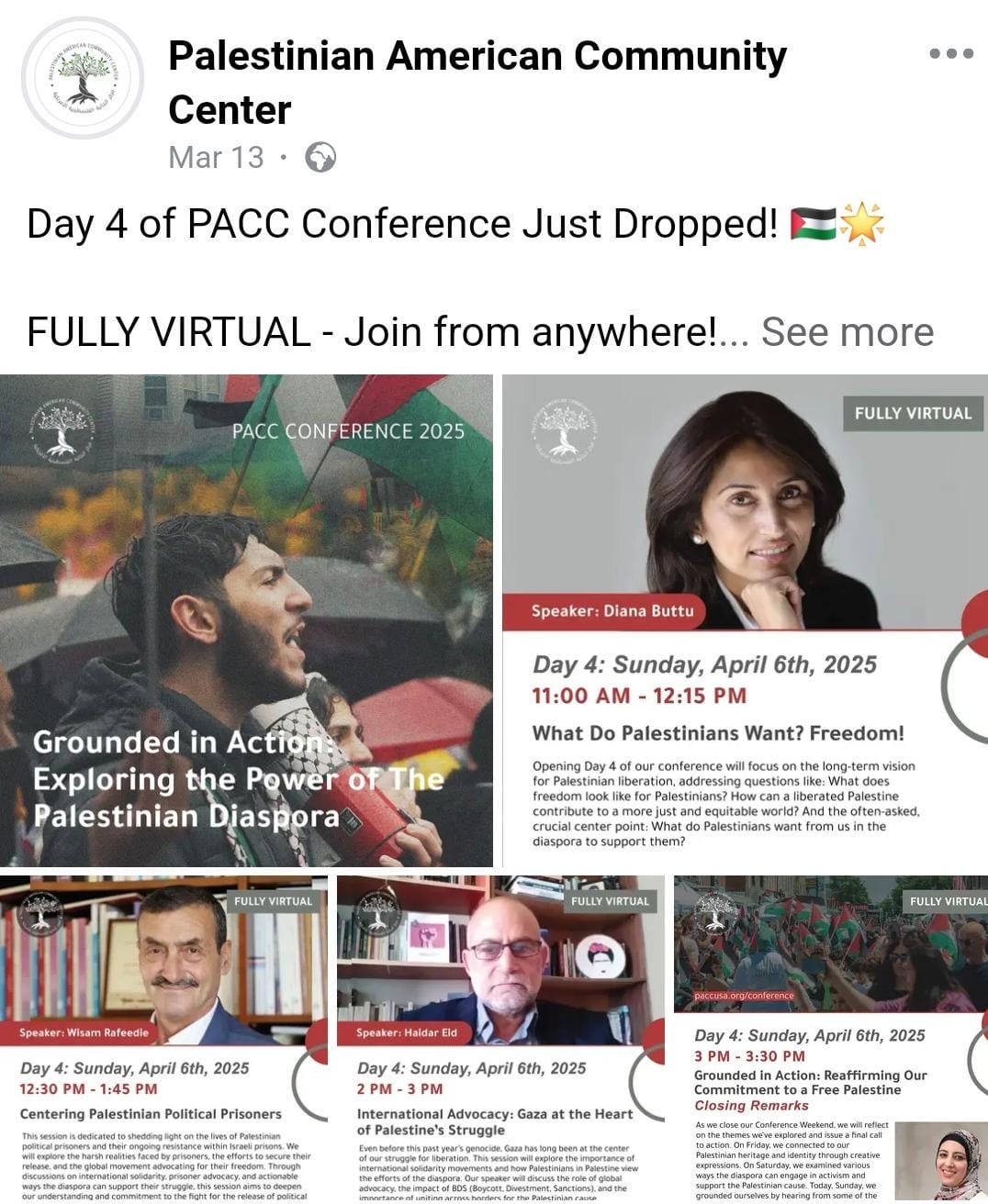 The current conference page on PACC’s website no longer lists speaker names or images, aside from Rep. Rashida Tlaib and her son, whereas the full lineup was visible just days ago. Despite this change, publicly available posts on PACC’s Facebook page still displays Rafeedie’s image and lists him as a featured speaker.