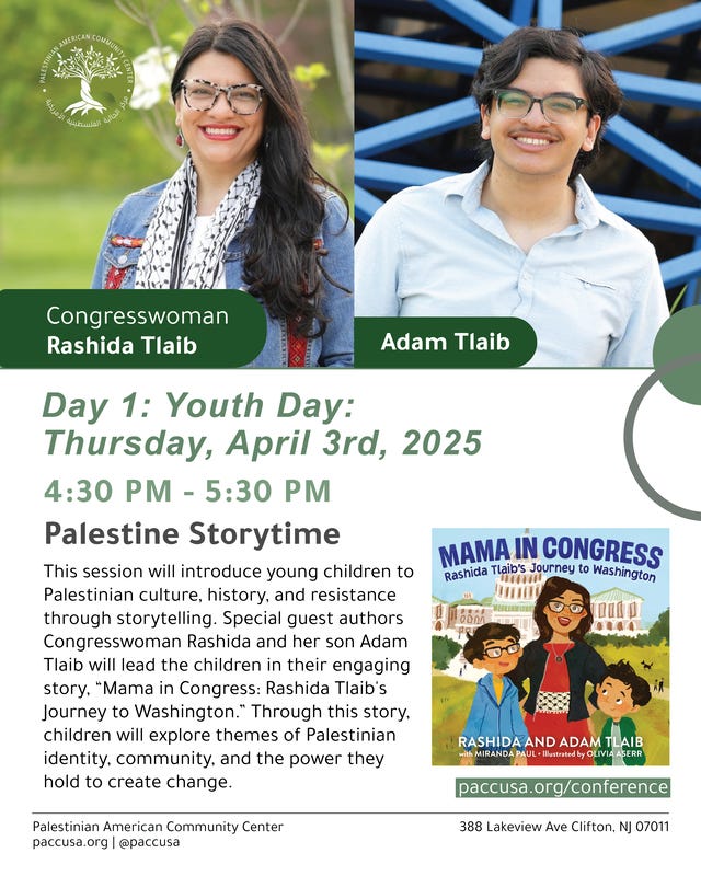 Furthermore, Congresswoman Rashida Tlaib is scheduled to speak at one of the conference’s "Youth Day" events, to introduce young children to “resistance through storytelling.” Members of National Students for Justice in Palestine (NSJP) and the Palestinian Youth Movement (PYM) are also set to speak at the conference.