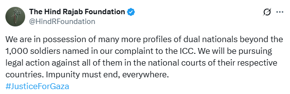 The foundation, officially registered in Belgium in September 2024, has pursued cases across multiple jurisdictions using universal jurisdiction principles. Its ICC complaint targets soldiers with dual citizenship from France, the United States, Canada, the United Kingdom, and the Netherlands. The organization has announced plans to pursue additional legal action against dual nationals in their respective home countries.