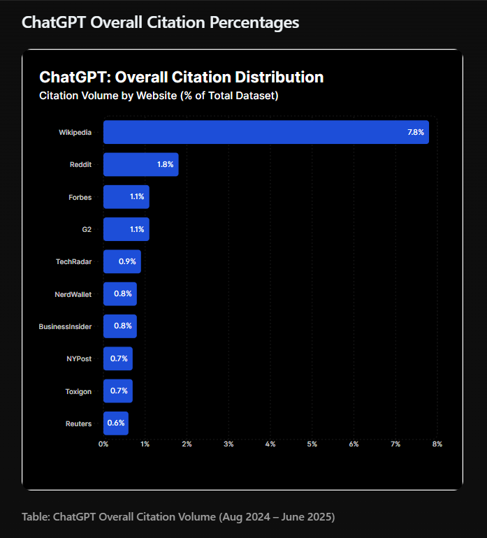 Senkfor’s report exposes a systematic campaign to corrupt Wikipedia, which serves as a heavily weighted source for training major AI models. Wikipedia appears in 7.8% of all GPT responses and represents nearly half (47.9%) of citations among the platform’s top 10 sources. This outsized influence makes it a prime target for manipulation.