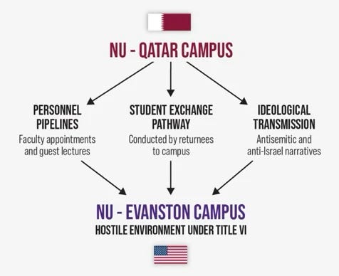 The report also documents how Qatar's massive investment has facilitated what researchers describe as a "bilateral academic, financial, and ideological integration" between the campuses. Faculty members with dual appointments regularly transport anti-Israel narratives between Doha and Evanston, contributing to the hostile environment for Jewish students that prompted federal Title VI investigations.