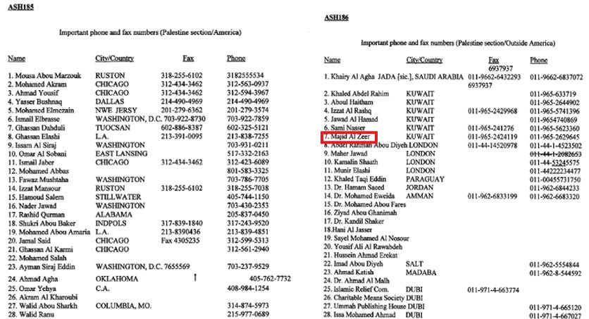 A document listing “Important phone and fax numbers (Palestine section)” seized during a 1994 FBI search of Palestine Committee leader Abdelhaleem Ashqar’s home shows Marzook listed as #1 for numbers “Inside America,” with CAIR co-founders Omar Yehia (Ahmad) and Nihad Awad also on the list. Al-Zeer appears as #7 on the page listing important numbers “Outside America.”