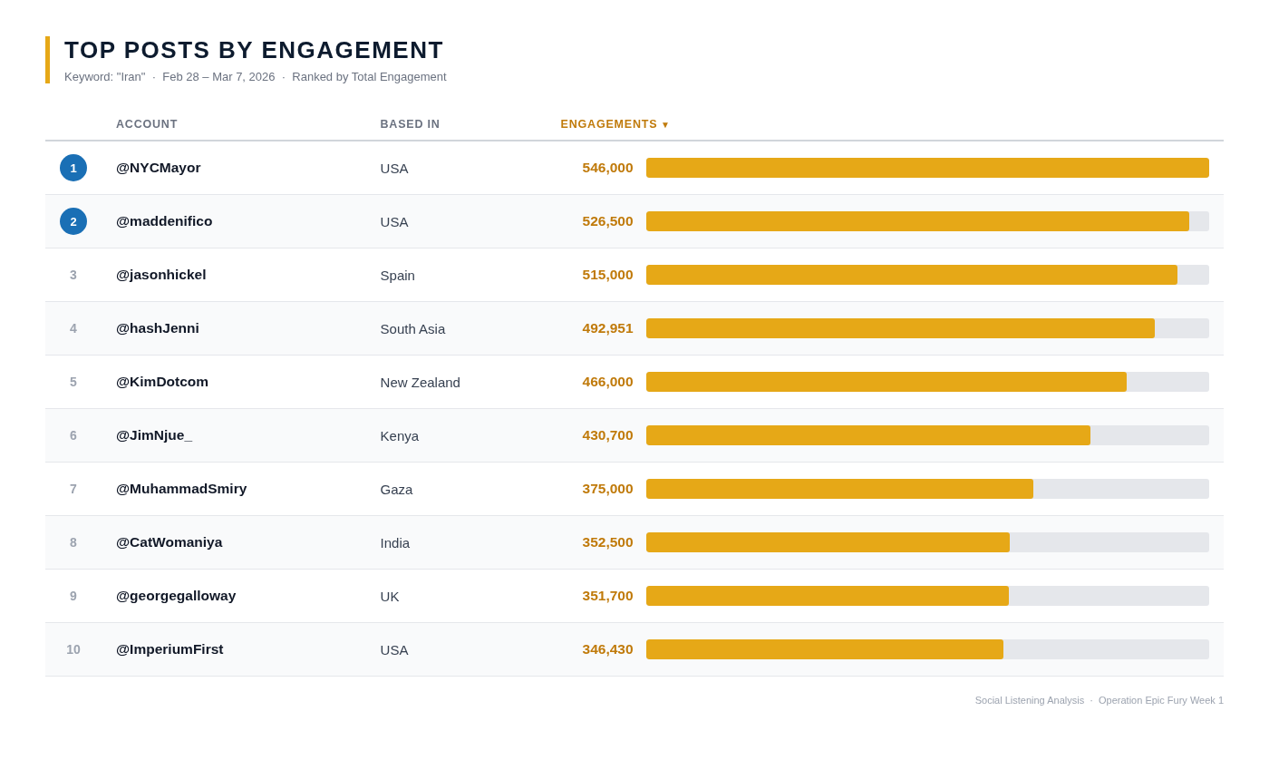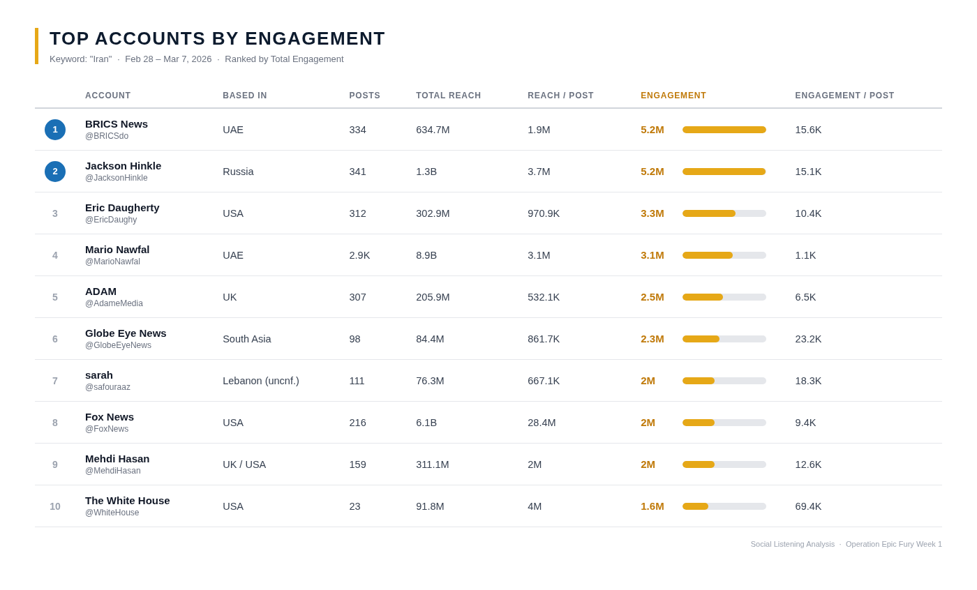 The firm’s seven-day social listening review, covering February 28 through March 7, tracked posts containing the keyword “Iran” and found an information environment of extraordinary scale: 98 million posts, 696.4 million interactions, and a staggering 1.5 trillion potential views. Within that volume, a clear pattern emerged at the top of the engagement hierarchy. Seven of the ten accounts generating the most interaction on the topic were based outside the United States, and every one of those foreign-based accounts was negative toward the operation.