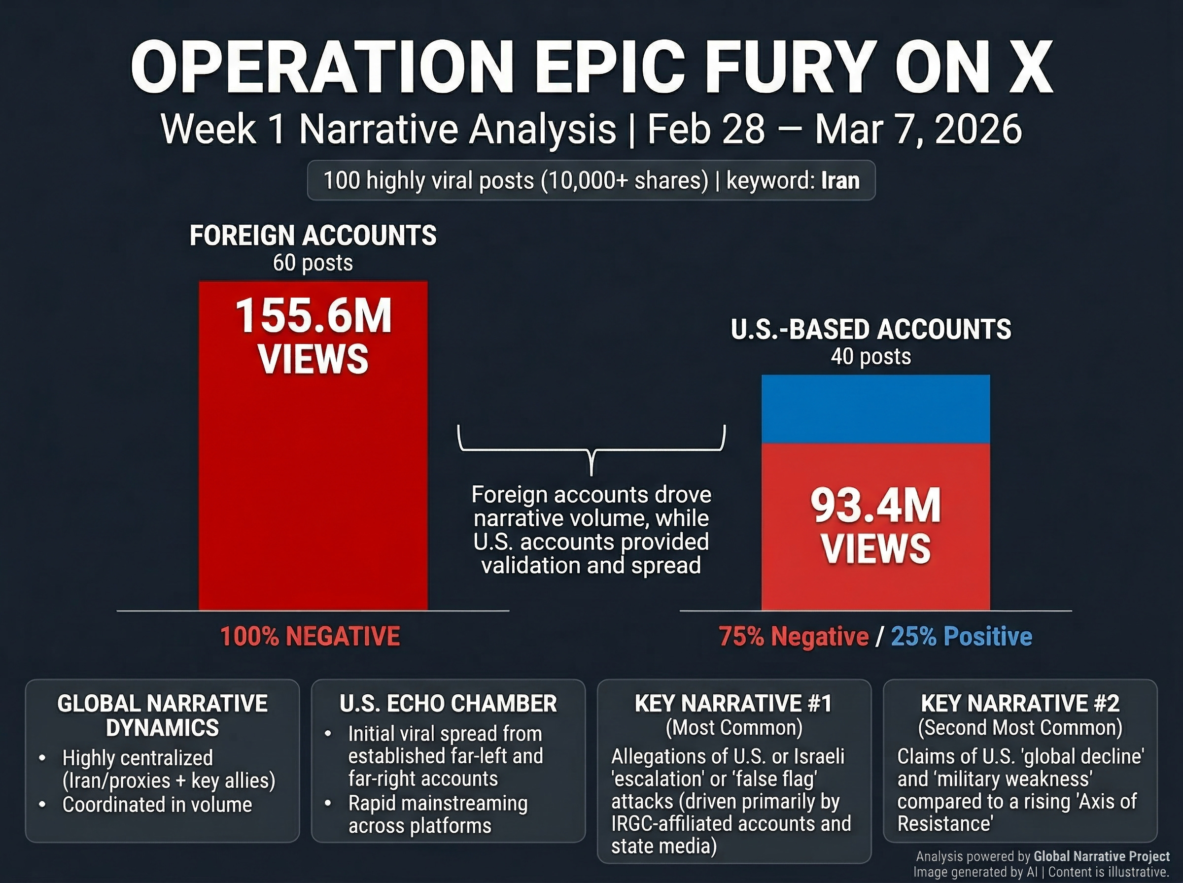 None of this is to say that criticism of Operation Epic Fury was purely manufactured or that no genuine domestic opposition existed. The point is that foreign-based accounts were disproportionately influential in driving the most visible anti-operation narratives on the platform. That matters because visibility is easily mistaken for consensus. When the most viral posts on a subject relentlessly push a single line, it creates the impression of a broad, organic public mood. As the week-one data makes clear, that impression was not fully accurate.