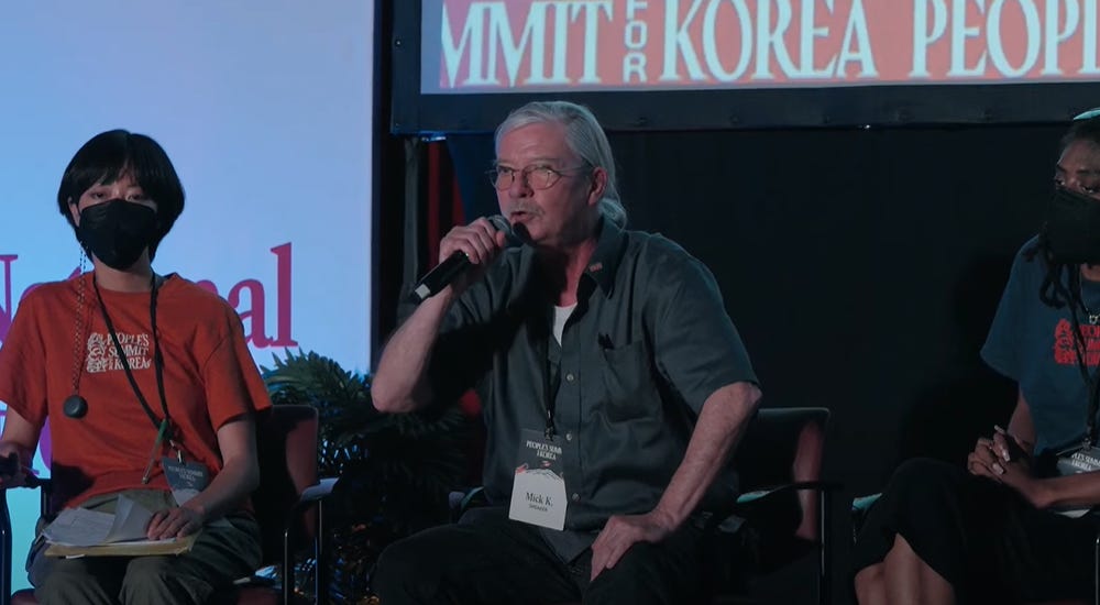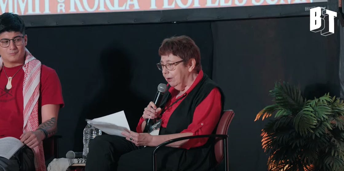 Mee-Hee Son, speaking through a translator, opened the conference with: "We pledge to stand in solidarity with and support the anti-imperialist national liberation struggles currently unfolding in Palestine, in Iran, and everywhere around the globe." She continued with explicit policy demands: "We're committed to advancing mass movements to halt U.S.–ROK–Japan joint military exercises, lift sanctions against North Korea, dismantle the fake UN Command, and establish a Korea peace agreement from an anti-imperialist perspective."