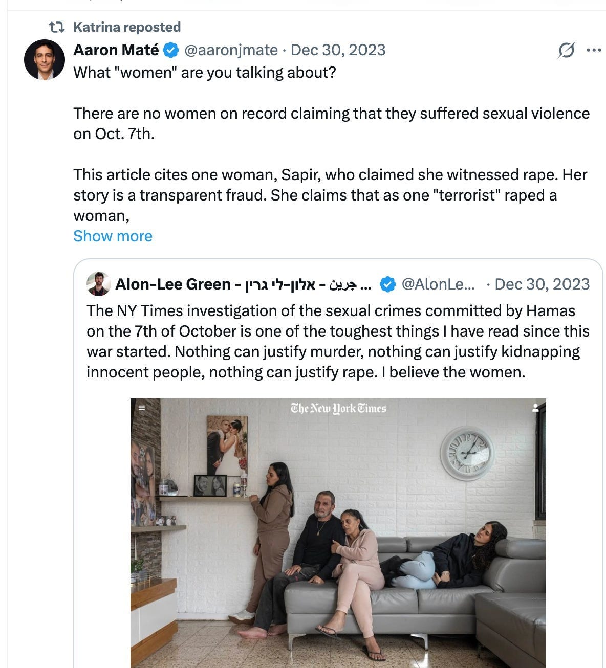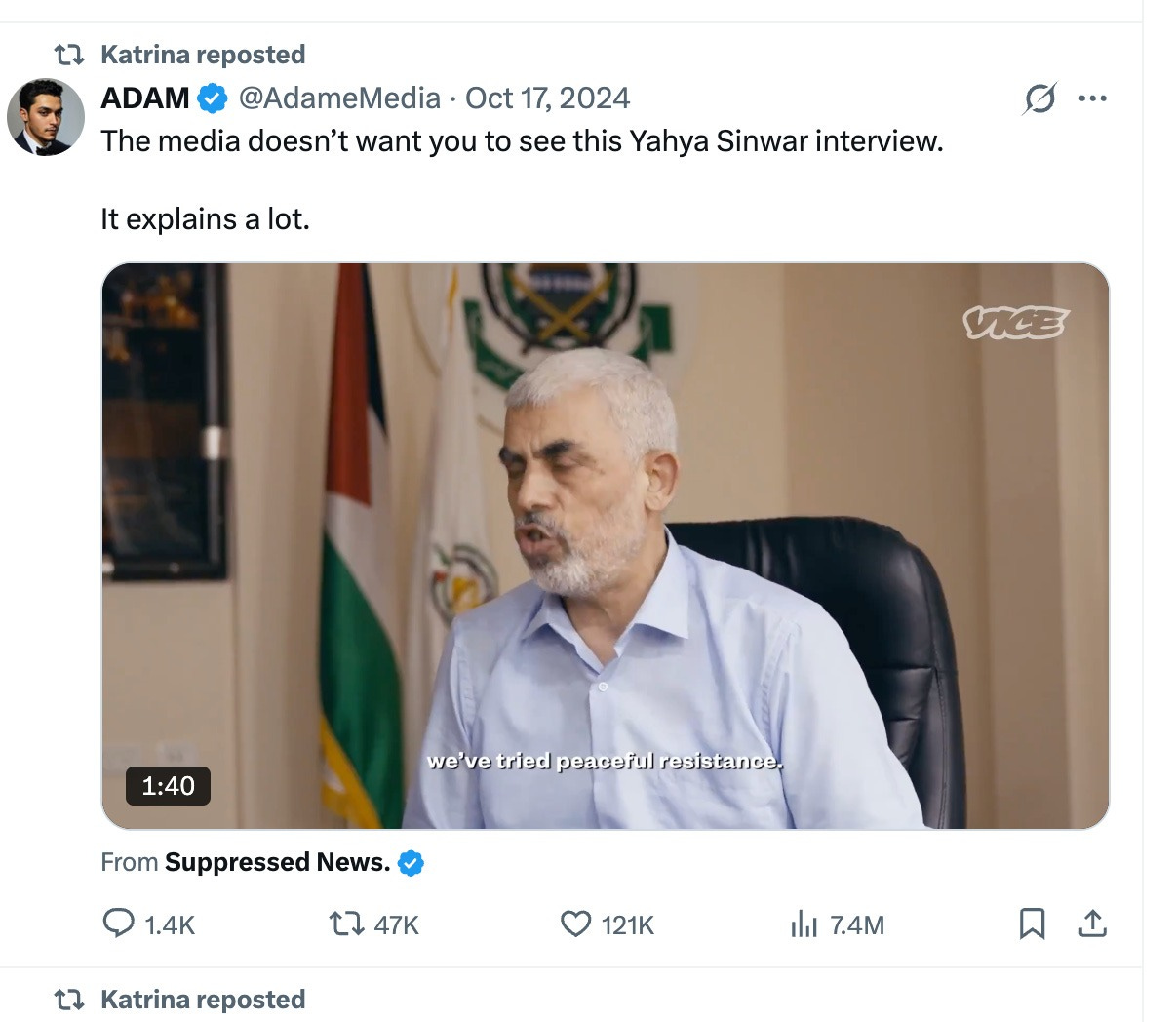 Records document Cassell re-tweeting a post of an excerpt of a VICE interview with former Hamas leader Yahya Sinwar. Additionally, Cassell shared a separate post linking to “On the Record with Hamas,” a Drop Site News article by Jeremy Scahill that features interviews with senior Hamas officials and other sources and presents Hamas’s perspective on the Oct. 7 attacks.