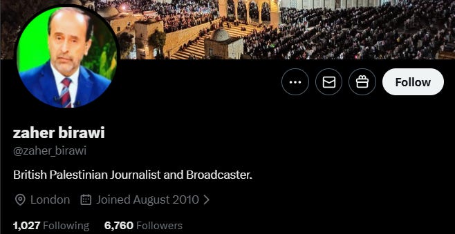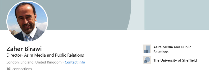 Zaher Birawi maintains a personal X account in Arabic with over 6,000 followers, opened in August 2010. He also maintains a professional profile on LinkedIn, Microsoft’s professional networking platform, listing 161 connections.