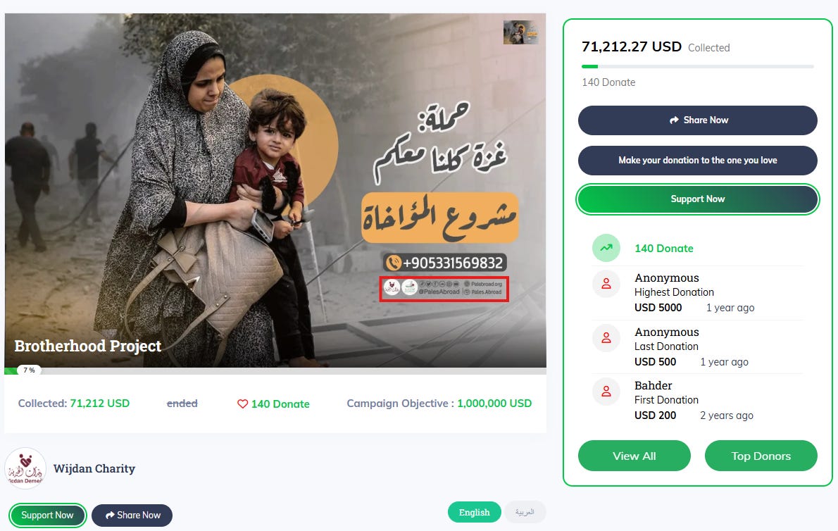 Additionally, in 2024, the Brotherhood-linked PCPA launched the “Day” fundraising campaign on Ensany, an Islamic charitable crowdfunding platform based in Malaysia. This campaign was jointly operated by PCPA and Wijdan Charity, a project active from 2023 to 2025 that allegedly aimed to strengthen the role of Palestinian civil society organizations in the protection of human rights. According to its stated objectives, one of Wijdan’s goals was to launch a “comprehensive smear campaign” opposing Israeli actions in the village of Masafer Yatta.