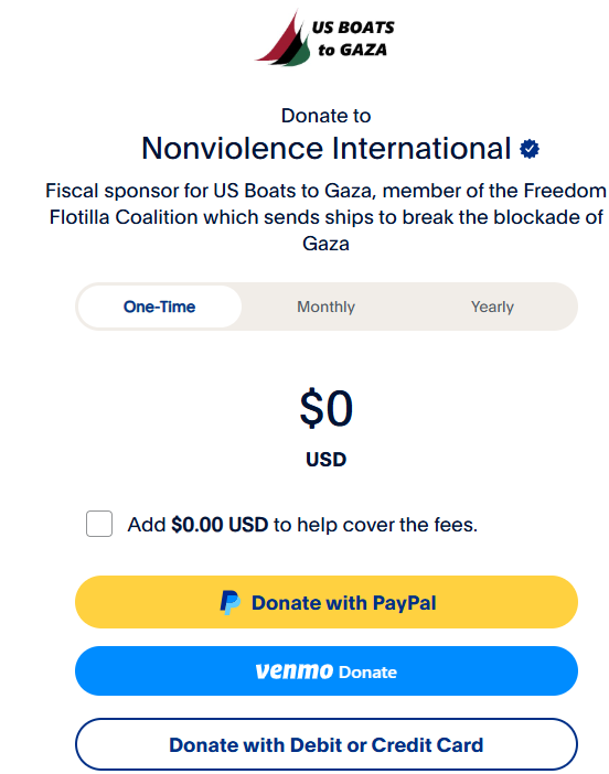 The Freedom Flotilla Coalition’s primary U.S.-based chapter, US Boat to Gaza, counts Zaher Birawi among its founding members. The group is fiscally sponsored by Nonviolence International and solicits donations through a PayPal fundraising page.