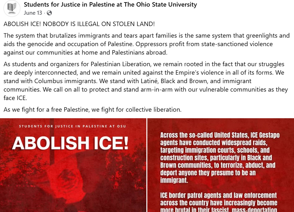Another post from June 2024 called to “ABOLISH ICE! NOBODY IS ILLEGAL ON STOLEN LAND,” comparing Immigration and Customs Enforcement agents to Nazi Gestapo and describing U.S. immigration enforcement as “fascist” and “brutal.” The post explicitly connected these issues: “The system that brutalizes immigrants and tears apart families is the same system that greenlights and aids the genocide and occupation of Palestine.” It also delegitimizes the United States by referring to it as “stolen land.”