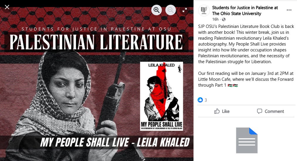 The event announcement describes the autobiography as providing “insight into how life under occupation shapes Palestinian revolutionaries, and the necessity of the Palestinian struggle for Liberation.” The announcement by SJP-OSU, which is an official student organization at the university, features an image of Khaled holding an AK-47 rifle.