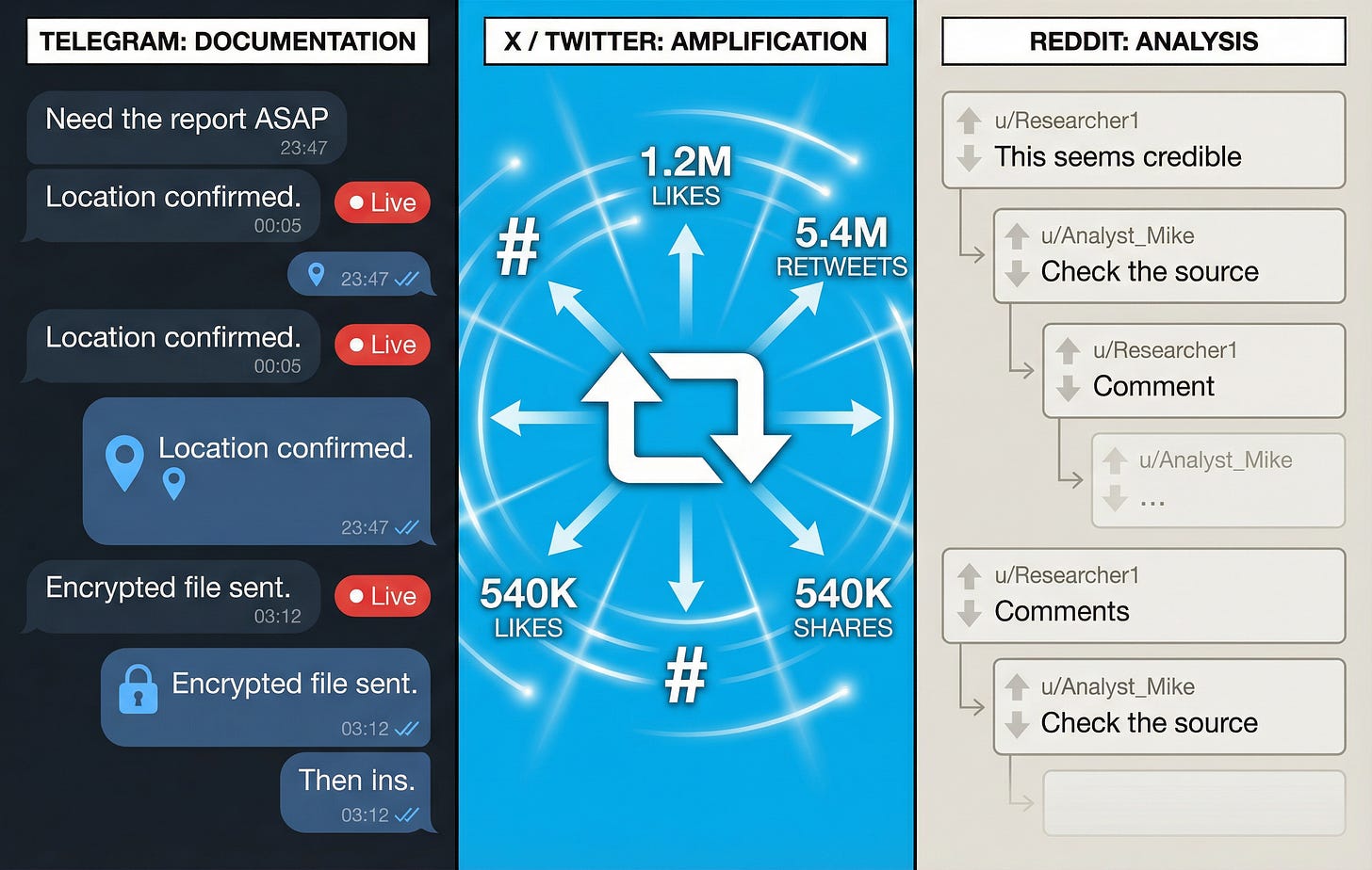 Reddit serves as the Analysis Engine—where threading and voting systems create “extended analytical discussions that process and contextualize information from other platforms,” hosting more reflective debate. “Telegram is generative, Twitter amplificatory, and Reddit contextualizing,” the researchers conclude.
