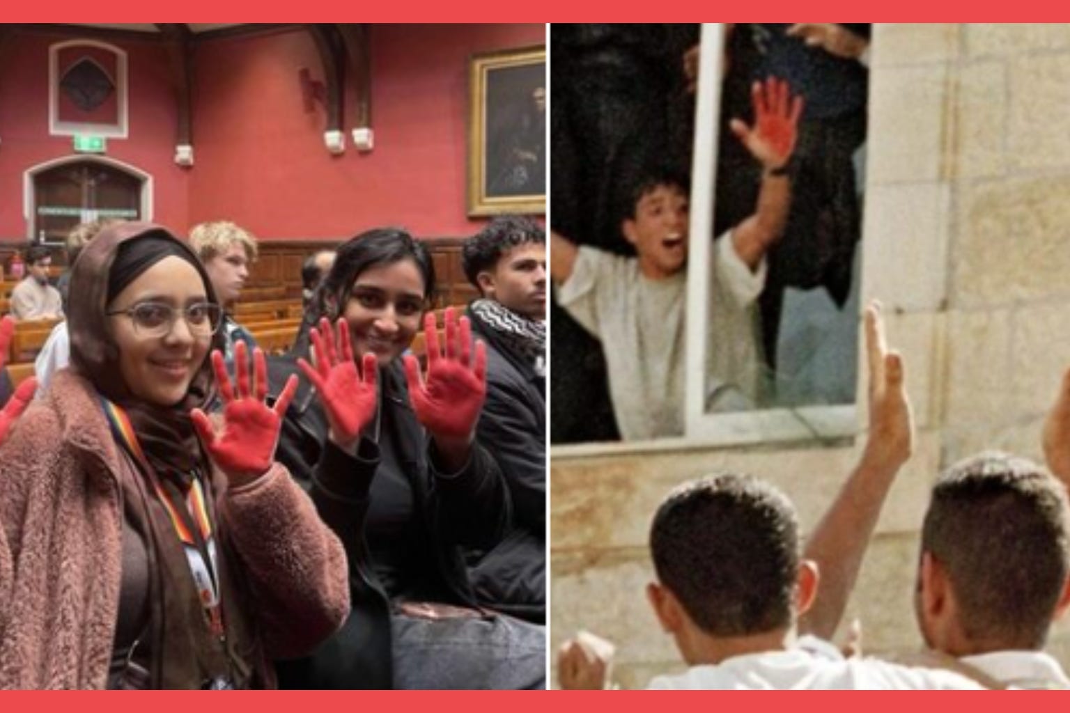 Former Israeli Prime Minister Ehud Olmert’s address at the Oxford Union on November 16 was disrupted by protesters who displayed red-painted hands inside the debating chamber, recreating imagery from one of the Second Intifada’s most notorious terrorist attacks.