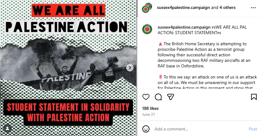 In a June statement, sussex4palestine.campaign wrote: “The British Home Secretary is attempting to proscribe Palestine Action as a terrorist group following their successful direct action decommissioning two RAF military aircraft.” The post continued: “an attack on one of us is an attack on all of us.”