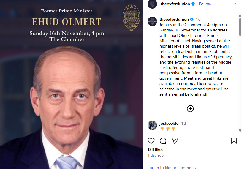 The Oxford Union had advertised Olmert’s 4:00 PM address as an opportunity to hear from someone “having served at the highest levels of Israeli politics” who would “reflect on leadership in times of conflict, the possibilities and limits of diplomacy, and the evolving realities of the Middle East, offering a rare first-hand perspective from a former head of government.” Meet-and-greet opportunities were made available to selected members.