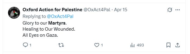 Oxford Action for Palestine’s X account posted in April: “Glory to our Martyrs. Healing to Our Wounded. All Eyes on Gaza” — employing terminology typically associated with terrorism rather than humanitarian activism.