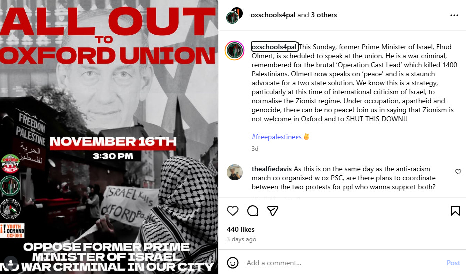 Oxford Schools 4 Palestine, in collaboration with Oxford Action 4 Palestine and Youth Demand Oxford, organized a counter-demonstration scheduled for 3:30 PM—thirty minutes before Olmert’s talk. Their promotional materials described Olmert as a “war criminal” who oversaw “Operation Cast Lead which killed 1400 Palestinians,” claiming he now advocates for a two-state solution as “a strategy” to “normalise the Zionist regime.” The post declared: “Zionism is not welcome in Oxford and to SHUT THIS DOWN!!”