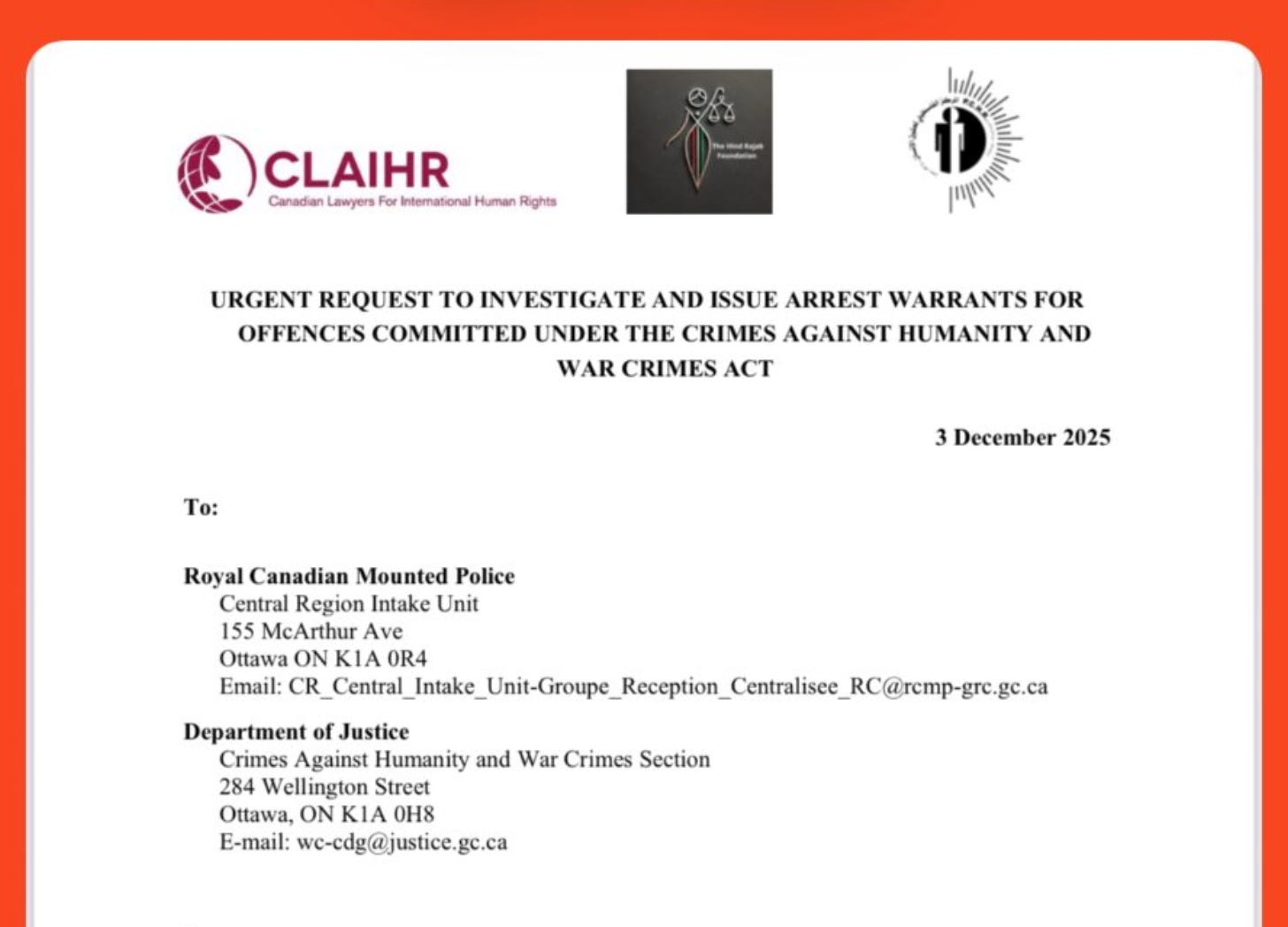 On December 3, 2025, the Hezbollah-linked Hind Rajab Foundation (HRF), Canadian Lawyers for International Human Rights (CLAIHR), and the PFLP-linked Palestinian Centre for Human Rights (PCHR), jointly filed a criminal complaint with the Royal Canadian Mounted Police and the Crimes Against Humanity and War Crimes Section of the Department of Justice.