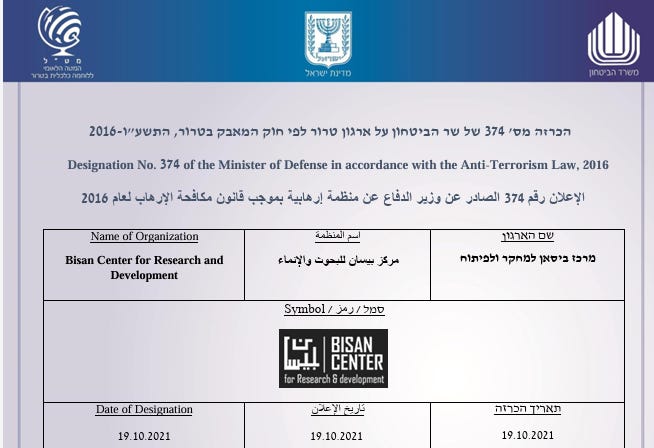 On October 22, 2021, Israel’s Ministry of Defense designated both the Bisan Center and UAWC as two of six organizations operating as part of a network of front groups for the PFLP. The official designation from Israel’s National Bureau for Counter Terror Financing stated that these organizations “present themselves as acting for humanitarian purposes; however, they serve as a cover for the promotion and financing of ‘Popular Front’ activity.”