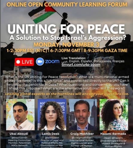 A November 3, 2025 webinar titled “Uniting for Peace” will feature Craig Mokhiber, a former UN human rights official, alongside Ubai Aboudi, a convicted member of the U.S.-designated terrorist organization Popular Front for the Liberation of Palestine (PFLP) who planned foiled suicide bombings.