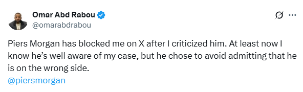 Omar Abd Rabou, a Palestinian journalist from Gaza known for his criticism of Hamas, says TV personality Piers Morgan blocked him on X after he criticized the broadcaster's coverage