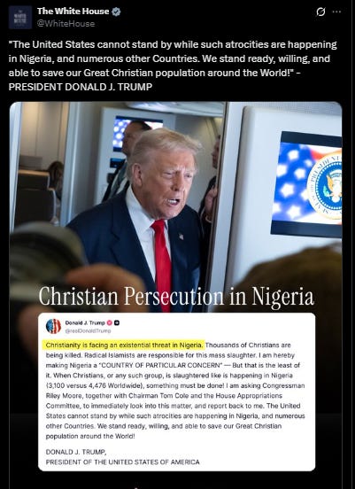 Following independent confirmation of Christian genocide by U.S. mission, Trump warns Nigeria of aid cutoff and possible military action against Islamist terrorists if government fails to act