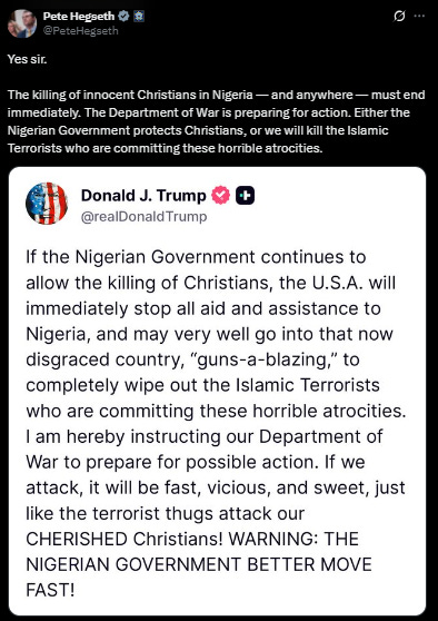 In a social media post on Saturday, Trump declared: “If the Nigerian Government continues to allow the killing of Christians, the U.S.A. will immediately stop all aid and assistance to Nigeria, and may very well go into that now disgraced country, ‘guns-a-blazing,’ to completely wipe out the Islamic Terrorists who are committing these horrible atrocities.”