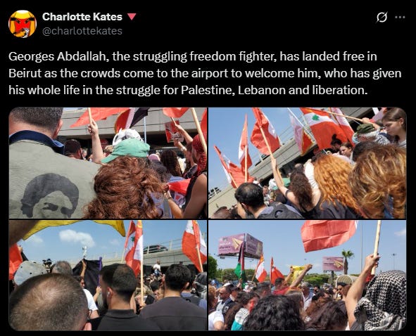 Charlotte Kates, Samidoun's international coordinator, posted on social media platform X: "Georges Abdallah, the struggling freedom fighter, has landed free in Beirut as the crowds come to the airport to welcome him, who has given his whole life in the struggle for Palestine, Lebanon and liberation."